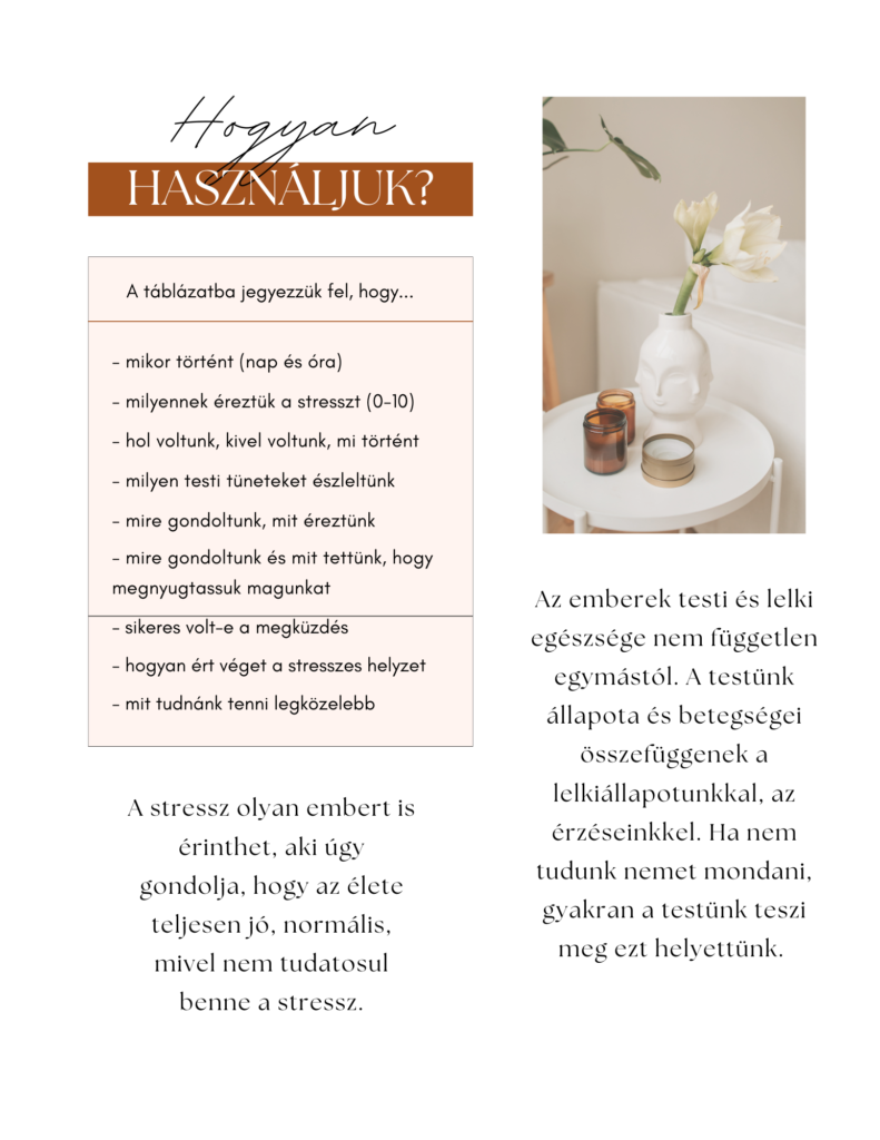 Ahhoz, hogy meg tudjunk küzdeni a stresszel, meg kell ismernünk azt. Ehhez arra van szükség, hogy minél többet tudjunk a stresszkeltő helyzetekről és a saját érzéseinkről, reakcióinkról.Sokan nem is érzik, hogy stresszben léteznek, mert megszokták azt, de a jó megfigyelés képessége fejleszthető! A napló segítségével naplózzuk minden egyes stresszes helyzetünket, ahogyan éppen történik. Fontos, hogy ne várjunk sokat vele, legjobb, ha akkor felírjuk, amikor éppen történik, így célszerű kinyomtatni.